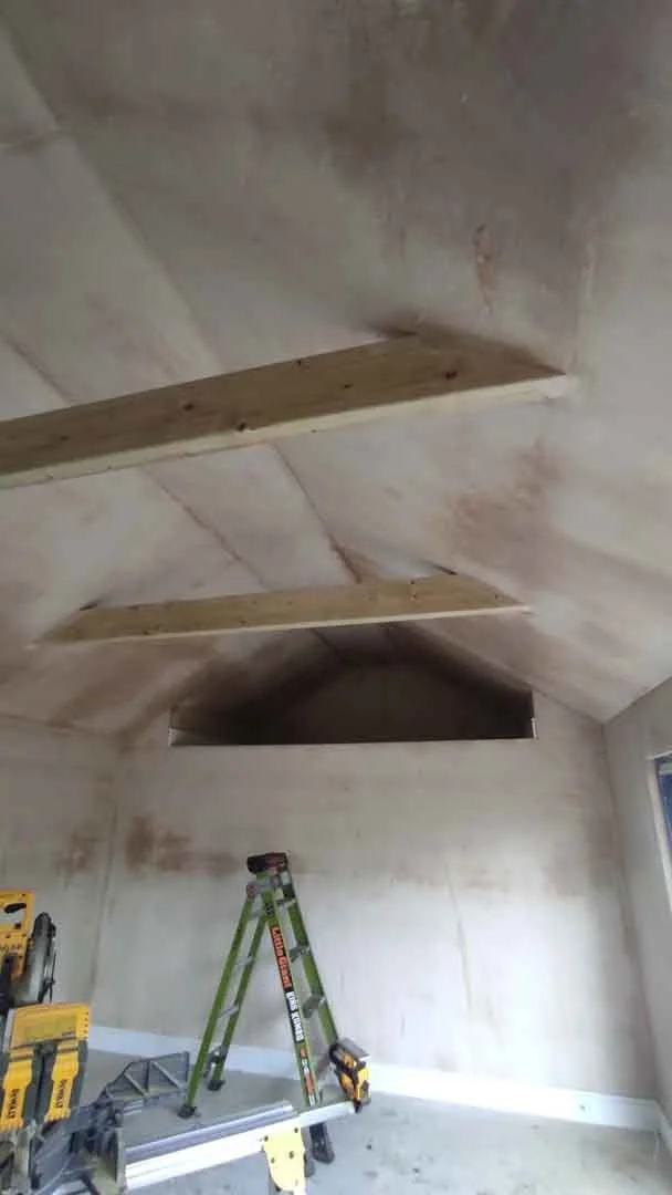 Features: Exposed tie beams, mezzanine level with ladder access, small entrance deck, and storage area.